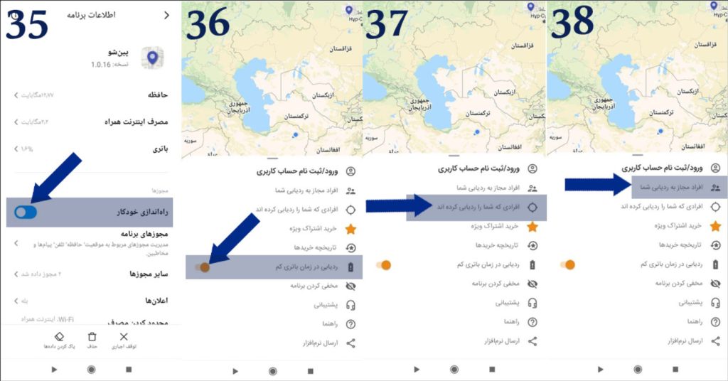۳۶. در منو داخل برنامه پین شو ردیابی در زمان کم باتری را فعال نمایید